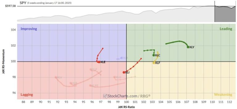 On the weekly RRG, XLY, XLC, and XLF remain firmly on the right-hand side of the graph despite their loss of relative momentum, which is causing the tails to roll over.